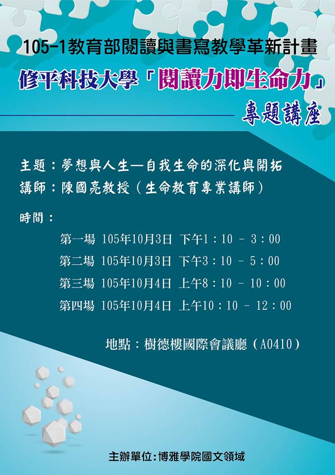 為推動以「閱讀力,就是生命力」為內涵的國文教學,因應數位時代學生特質與 學習型態的變化,透過生命教育專家陳國亮教授主講「生命關懷與自我探索」等 系列講座,以「夢想與人生‐自我生命的深化與開拓」為題,藉以激勵修平師生持 續開拓閱讀與書寫的熱情與深度,共同經營有意學習的課堂氣氛。