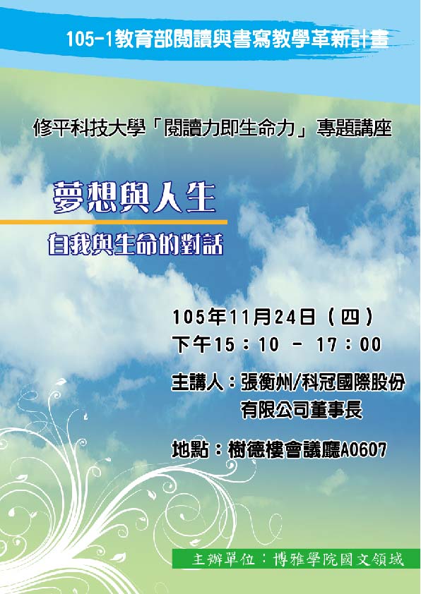 為推動以「閱讀力,就是生命力」為內涵的國文教學,因應數位時代學生特質與 學習型態的變化,特邀請成功企業家─科冠國際股份有限公司董事長暨精科產學 合作召集人、中華技職暨產業合作協會副理事長張衡州先生蒞校主講「生命關懷 與自我探索」等系列講座,以「夢想與人生-自我與生命的對話」為題,分享創業 經歷與自我生命的故事,藉以激勵修平師生持續開拓閱讀與書寫的熱情與深度, 共同經營有意學習的課堂氣氛。